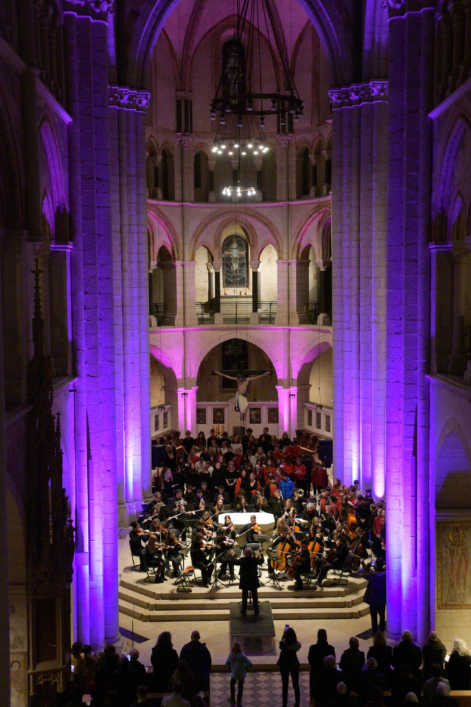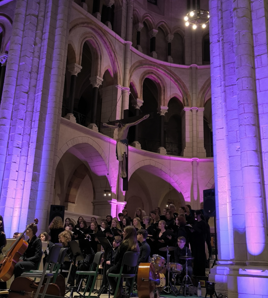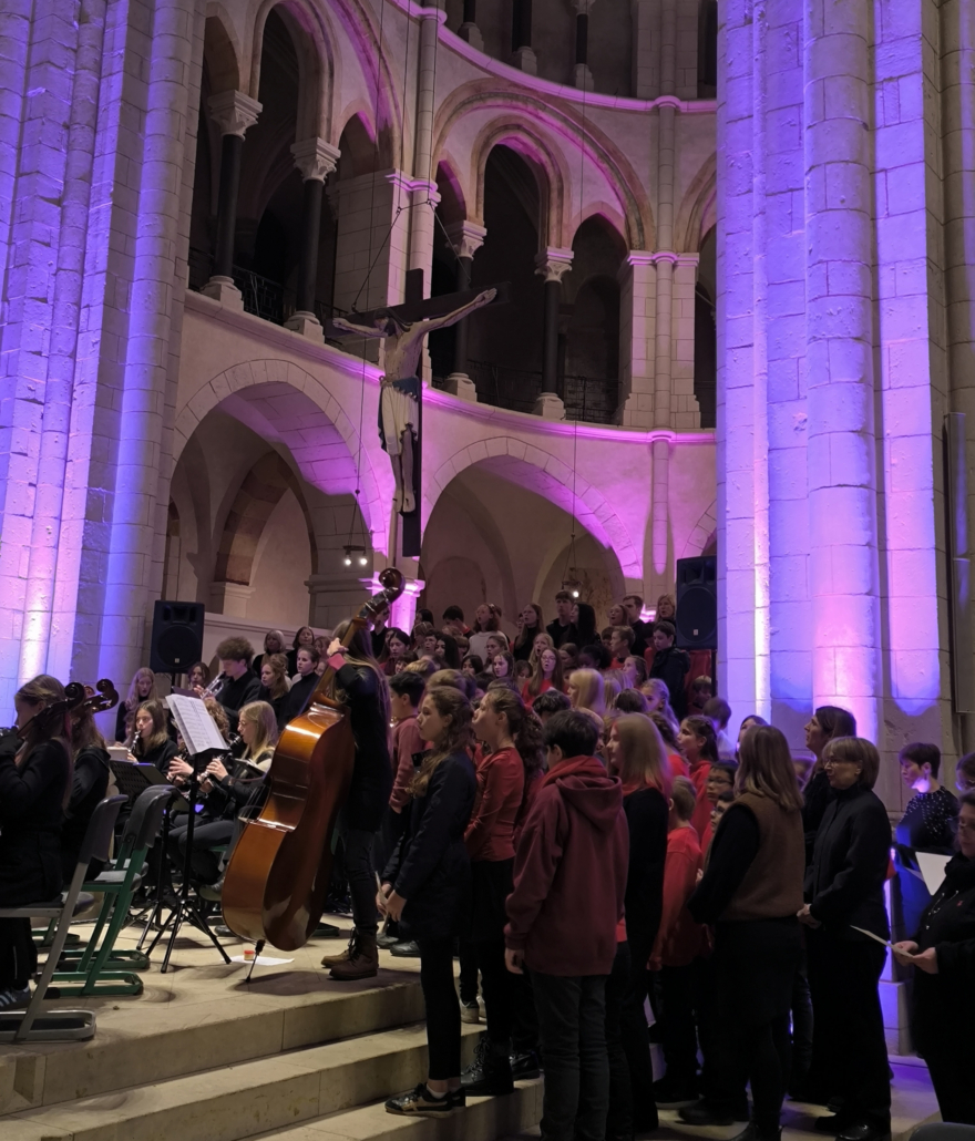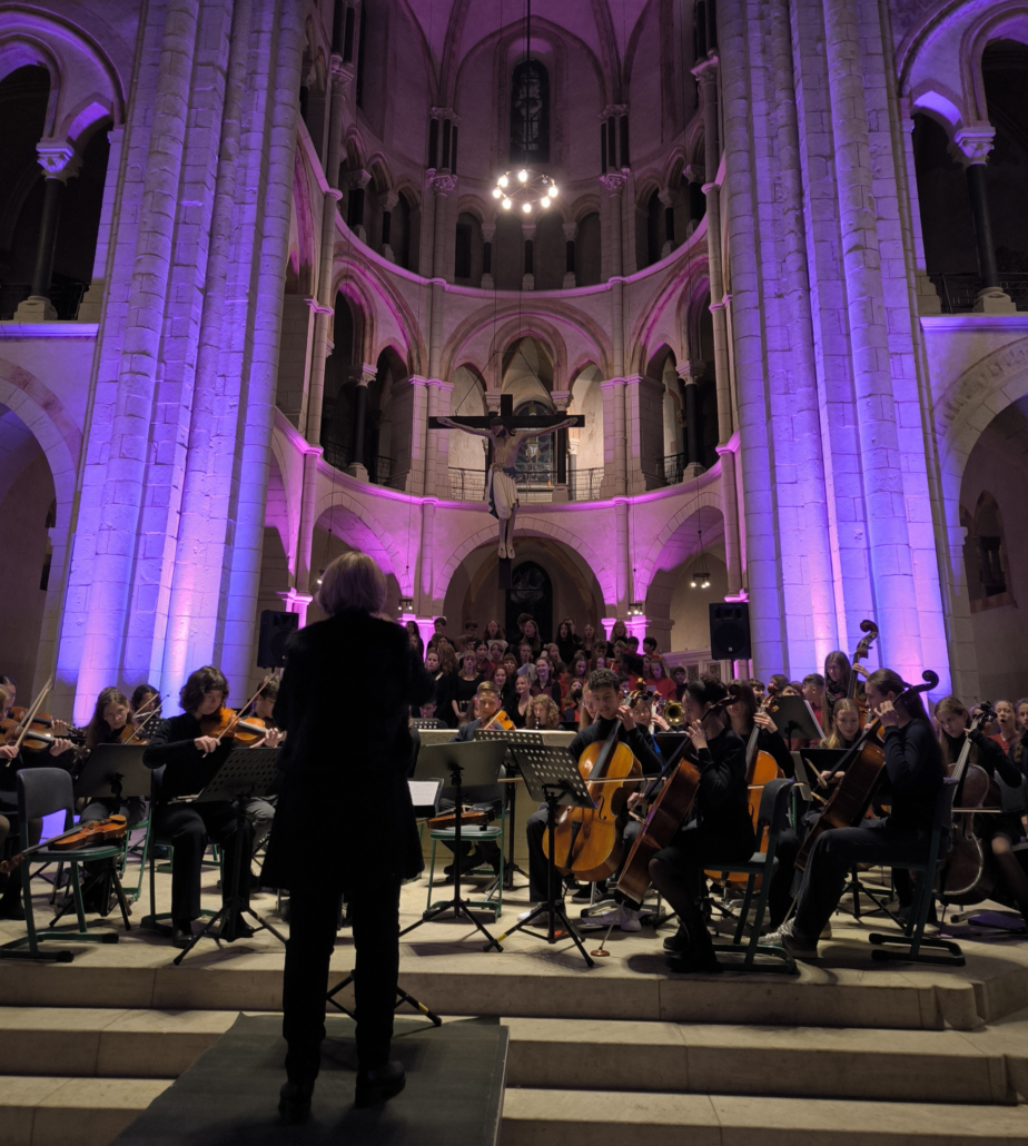 In seiner anschließenden Antrittsrede bedankte sich Dr. Fröhlich für das Vertrauen, das ihm von Kollegium, Eltern und Schülerschaft sowie dem Schulamt, das mit Herrn Scholz und dem zuständigen schulfachlichen Dezernenten Jochen Reinhardt gleich zweifach vertreten war, entgegengebracht wurde und zeigte sich voller Demut gegenüber den vielfältigen Aufgaben. Sein zentrales Bild war das der Schule als Orchester: Der Gesamtklang entstehe auch durch starke individuelle Stimmen. Aufgabe der Schulleitung sei es, das Orchester durch schwierige Passagen zu führen, Entscheidungen zu treffen, Wege aufzuzeigen und Abwägungen transparent zu machen. Dazu gehöre auch eine Fehlerkultur mit dem beständigen Mut, Entwicklungen voranzutreiben und Vorhaben zu erproben, um Lösungen und neue Wege zu finden. Dies alles gelinge am besten mit gegenseitigem Vertrauen, in kollegialer Verbundenheit und vor einem wertschätzenden Umfeld.